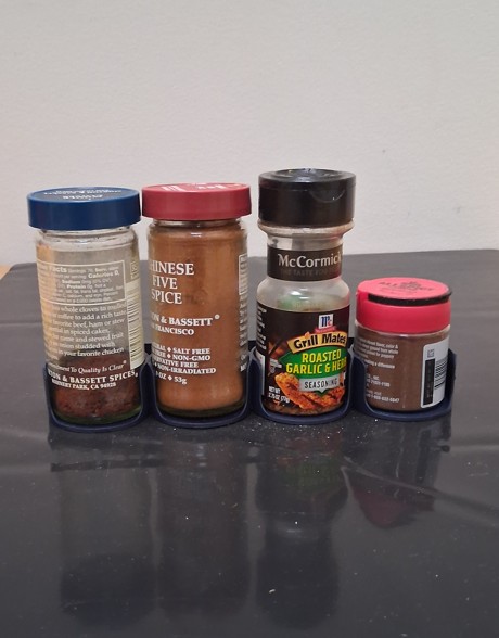 The connected design keeps four frequently-used spices organized in one compact footprint rather than scattered across the counter.